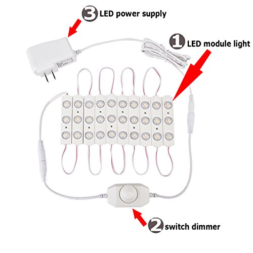 Package Includes: This mirror light kit includes 10pcs LED module lights (each mudule light includes 3LEDs), 1pcs switch dimmer and 1pcs LED power supply. LED module light spread length is 6.56ft, dimmer plus cable length is 1.3ft, LED power supply cable length is 5.25ft