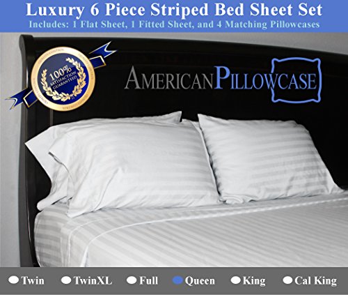 American Pillowcase 100% Egyptian Cotton Luxury Striped 540 Thread Count 6-Piece Sheet Set with Wrinkle Guard - Queen, White