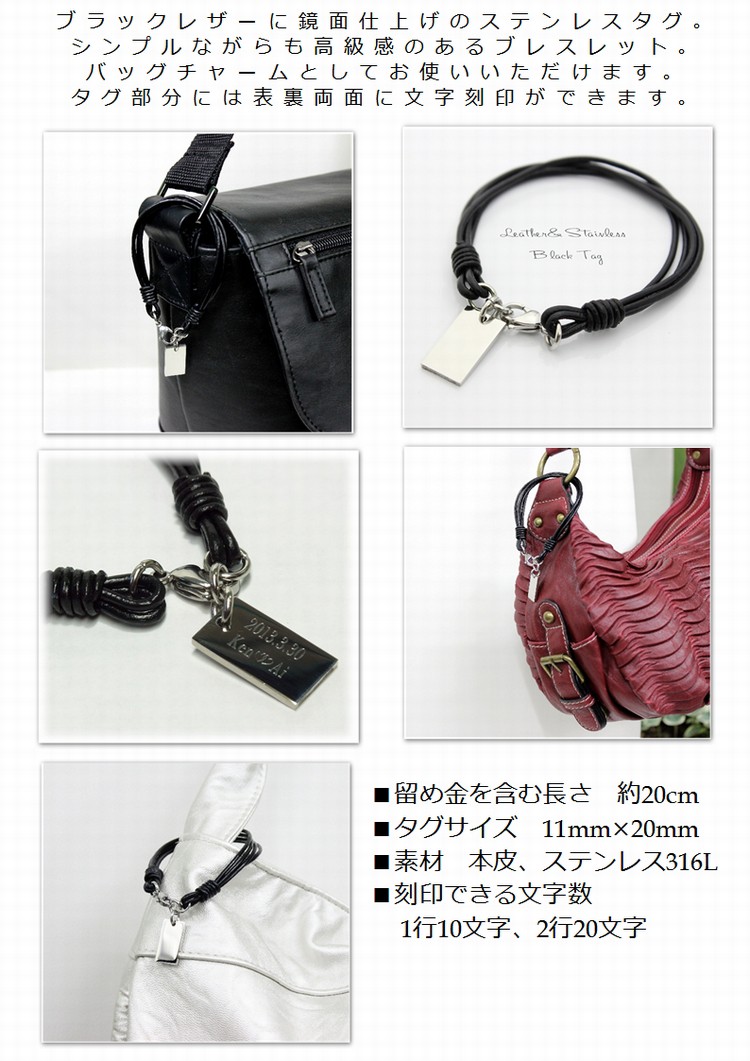 ブラックレザーに鏡面仕上げのステンレスタグ。シンプルながらも高級感のあるブレスレット。タグ部分は文字刻印ができます。刻印をご希望の場合、刻印券が必要となります。商品と一緒に「刻印券」を必要枚数カートに入れてご注文ください。誕生石のセッティングも同様に、商品と一緒に「誕生石券」を必要枚数カートに入れてご注文ください。■留め金を含む長さ 約20cm■タグサイズ 11mm×20mm■素材 本皮、ステンレス316L■刻印できる文字数 1行10文字、2行20文字■5400円(税込)以上ご購入の方は送料無料配送方法のご指定は出来ませんのであらかじめご了承ください。沖縄県、一部離島の方は日時指定が出来ません。代引き手数料は全国一律324円(税込)となります。ステンレスは肌に優しく、敏感肌の方にもお勧めの素材です。皮脂や汗、水、海水、温泉などで濡れてもほとんど変色せず、傷にも強いことから、腕時計の素材としてもよく使われています。