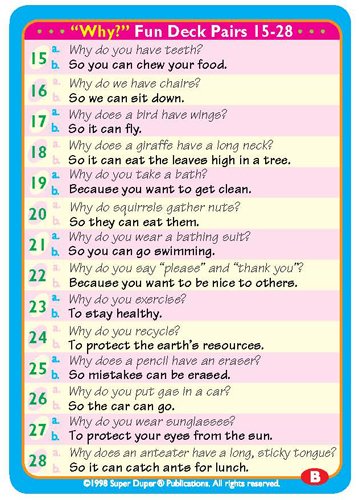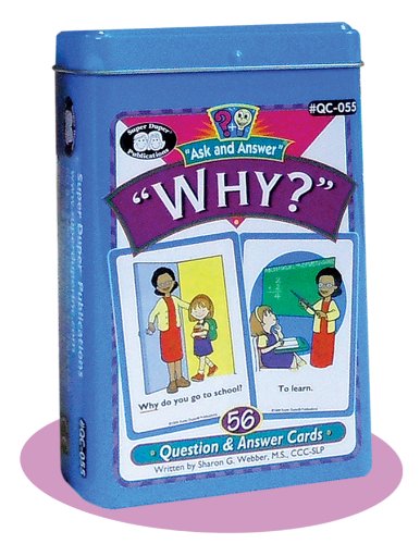 -. Feature : 56 colorfully illustrated cards (2 1/2" x 3 1/2") - 28 pairs of "Why?" Question/Answer cards (i.e., Why do you go to school?... To learn) / Includes master questions, storage tin, and game ideas, and storage tin / Stimulates language development, improved vocabulary, and basic reasoning skills / Over 30 Super Duper Publications Apps available on the Amazon Appstore for Android / You might enjoy our other Ask and Answer "WH" Card Decks- also available on Amazon