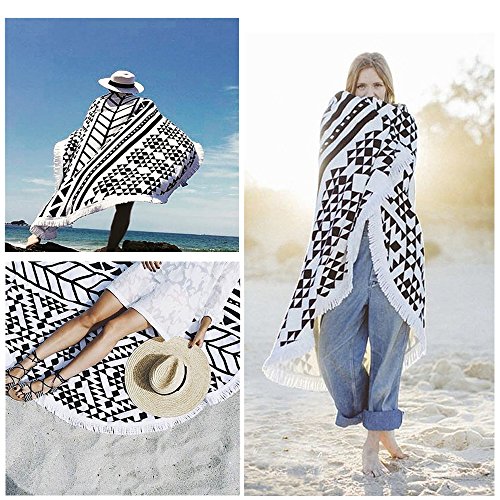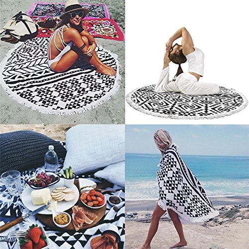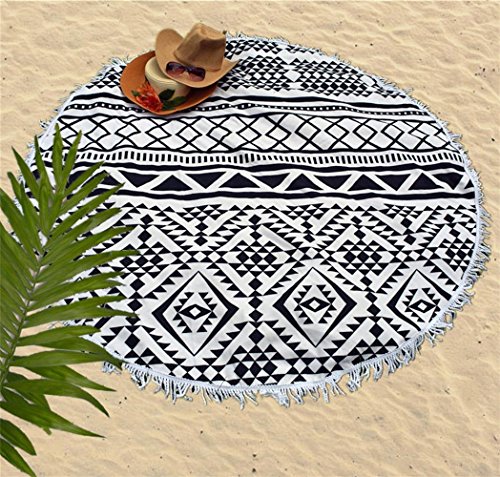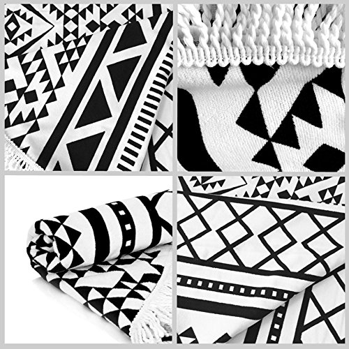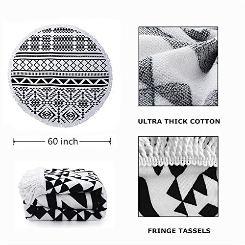 Large Round Beach Towel Black and White with Fringe Tassel 60-Inch,Ultra Soft Super Water Absorbent,Circle Beach Towel Round Microfiber/Mandala Yoga Mat/Table Cloth/Bath Rug/Tassel Rug/Bath Cloth