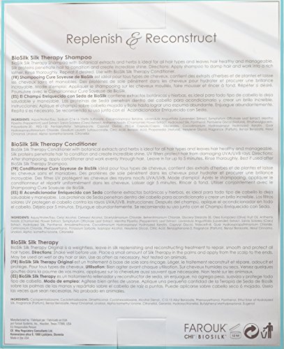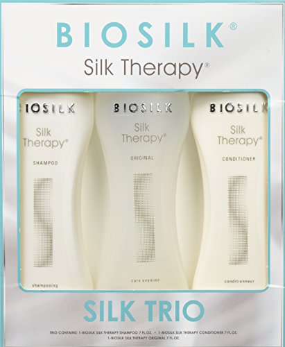 BioSilk Silk Therapy Ideal for all hair types; Leave in Replenishing and reconstructing treatment; Bonds and strengthens the hair inside and outside; Fills any voids on cuticle layer; Repairs split ends Protects (Heat, UV, Cold, Pollution); Incredible shine; No build up, no weight; and Fantastic for skin care Silk Therapy Shampoo Ideal for all hair types; Leaves the hair clean, healthy and shiny; Enriched with Silk Proteins Gently cleanses the hair in a rich luxurious lather; and Provides incredible body and shine Silk Therapy Conditioner Ideal for all hair types; Lightweight, Self Adjusting Formula; Silk infused primarily on dry or damaged parts of hair, providing balanced conditioning; Provides body, volume, and incredible shine; and Soft, silky and manageable hair.Feature