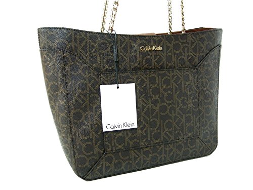 -. Title : New CK Logo Purse Hand Bag Tote Brown Khaki Lage Tan Chain Strap