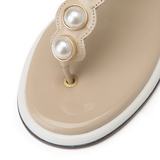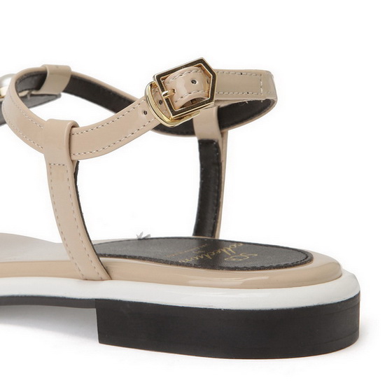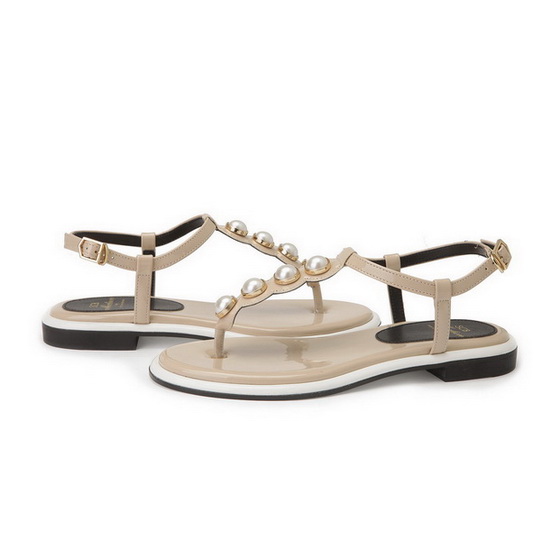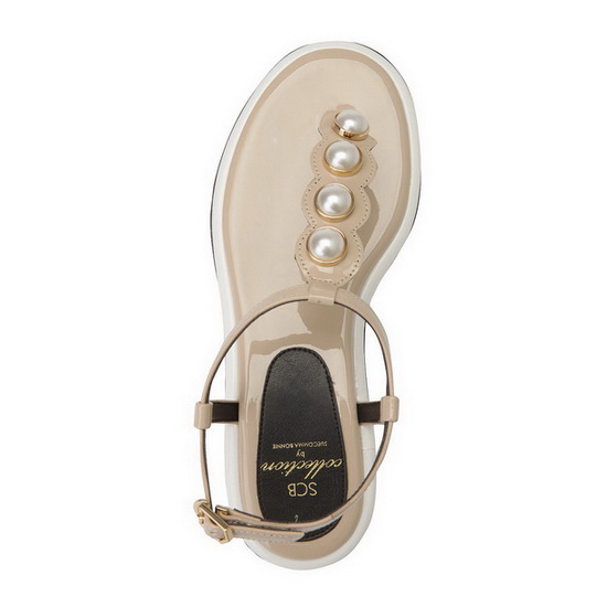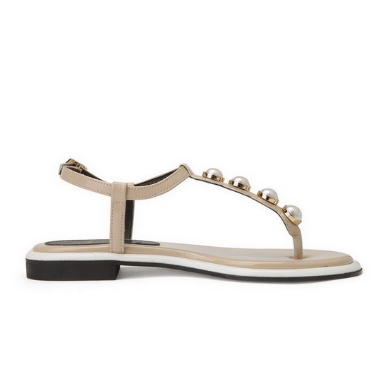 - 발등의 진주 디테일을 적용한 샌들.