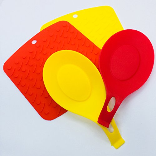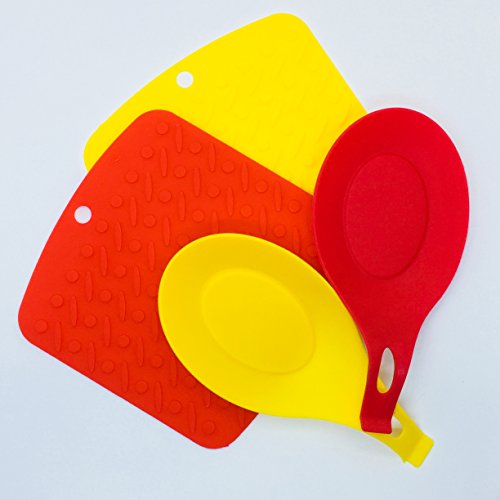 GuteKüchen Silicone Spoon Rest & Tray Mat Double Set, Heat Resistant Colorful Scoop, Spatula, Ladle, Kitchen Utensil resting, Multipurpose Ideal Use To Keep Stove, Table, & Countertop clean, Set of 4