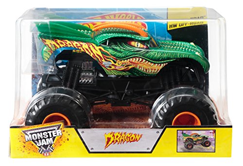 -. Binding : Toy -. Brand : Hot Wheels -. EAN : 0887961062441 -. Feature : With even more accurate designs, this 1:24 scale truck is made with durable die-cast metal parts / Decorated just like its high-flying, car-crushing, oversized inspiration / Its monster wheels are ready for mega tough terrains, too! / Pick up the other vehicles in the assortment and head to the Monster Jam arena for head-to-head battle! / Who will dominate and who will be destroyed -. IsAdultProduct : 0 -. Label : Mattel -. LegalDisclaimer : Must be at least 18 & over to purchase -. Manufacturer : Mattel -. Model : CGD65 -. MPN : CGD65 -. NumberOfItems : 1 -. PackageQuantity : 1 -. PartNumber : CGD65 -. ProductGroup : Toy -. ProductTypeName : TOYS_AND_GAMES -. Publisher : Mattel -. Studio : Mattel -. Title : Hot Wheels Monster Jam 1:24 Scale Dragon Vehicle -. UPC : 887961062441 -. Warranty : 1 year warranty against manufacturer defects