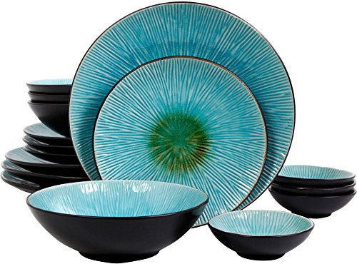 -. Feature : Imported / Shangri-La Court dinnerware set features a textured interior design &a turquoise blue crackle glaze finish / This stoneware set by Gibson includes four each 10.75'' dinner plates, 8.25'' salad plates, 7.5'' bowls & 4.5'' fruit bowls / Perfect for entertaining or everyday use.