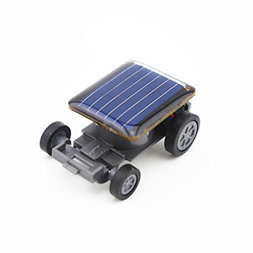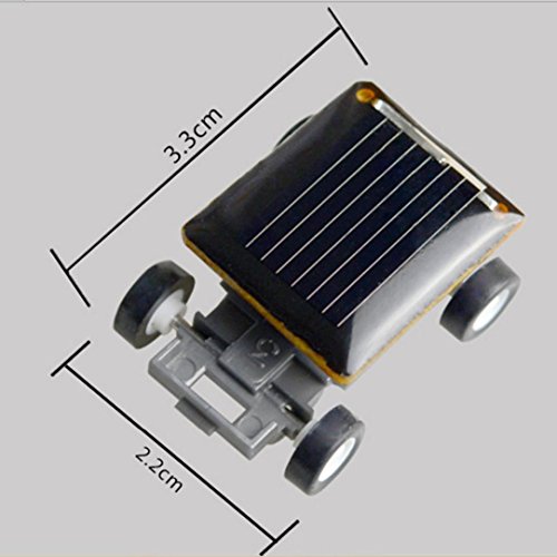 Product Description Descriptions: Solar Powered - No batteries required Solar panel covers the entire roof, and makes this baby fly Excellent for demonstrating solar power in action About the size of a quarter No Battery Require Size:33mm x 22mm x 14mm Package: 1 x Solar Power Energy Mini Car 0