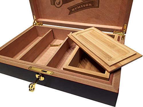 - ★ LOCKING STASH BOX WITH KEY - Premium lock box with two gold keys, two adjustable dividers, removable stash box with rolling tray lid, and gold hinges that lock at 90 degrees, preventing the lid from flipping over.