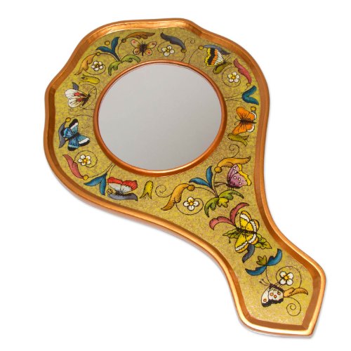 NOVICA Shabby Chic Hand Glass and Wood Wall Mounted Mirror, Yellow 'Lemon Butterflies'