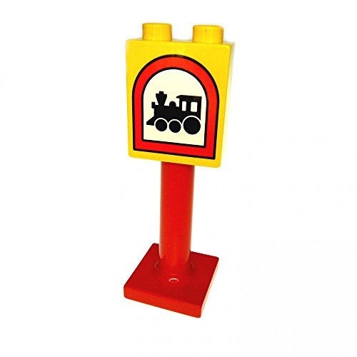 -. Title : LEGO Duplo Red Sign Post Tall with Yellow Brick 1 x 2 x 2 with Road Sign Train Pattern x1 Loose