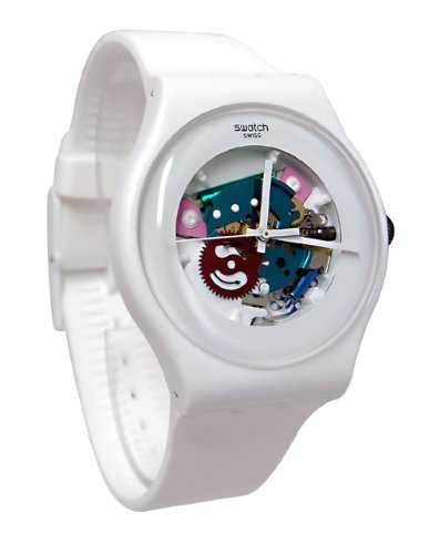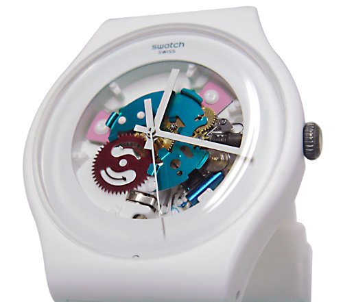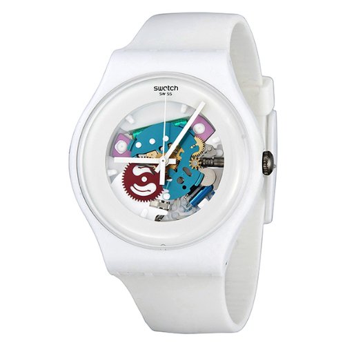 ReleaseDate : 2014-09-30 Studio : Swatch Publisher : Swatch Binding : Watch Product Description White plastic case with a white silicone strap. Fixed white plastic bezel. White dial with white hands. Dial Type: Analog. Quartz movement. Scratch resistant mineral crystal. Push/pull crown. Solid case back. Case diameter: 42 mm. Case thickness: 9.8 mm. Round case shape. Tang clasp. Water resistant at 30 meters/ 100 feet. Functions: hour, minutes, seconds. Casual watch design. Watch label: Swiss Made. Swatch White Lacquered White Silicone Unisex Watch SUOW100. 0