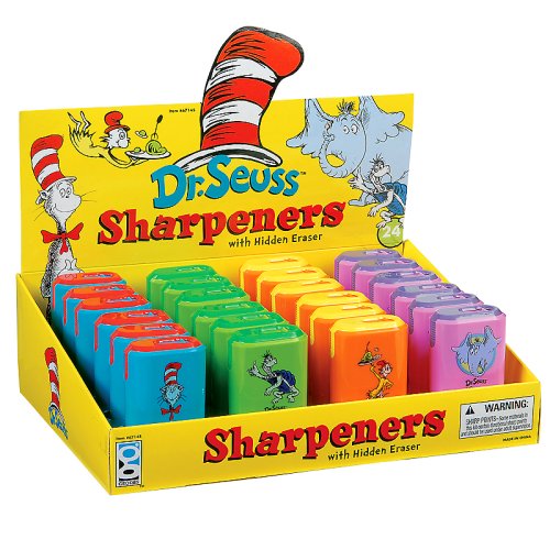 About the Dr. Seuss™ Sharpener & Eraser. So, you have some heavy-duty writing to do. If the first thing you reach for is a pencil, let the second thing be our Dr. Seuss Sharpener & Eraser tool. As every pencil pusher knows, a good sharpener and eraser are essential tools. This convenient school tool combines a sharpener on one end and a large, beveled eraser on the other. Each barrel features favorite characters from four classic Dr. Seuss childrens books—The Cat in the Hat, Yertle the Turtle, Horton Hears a Who, and Green Eggs and Ham—in bright, two-tone colors of red/blue, dk green/lt green, yellow/orange, and purple/pink. Remove cap on either end to reveal eraser or empty shavings. Assortment contains designs from four classic Dr. Seuss™ books. Sharpener opening slides closed to prevent spills. 2 1/2" tall.