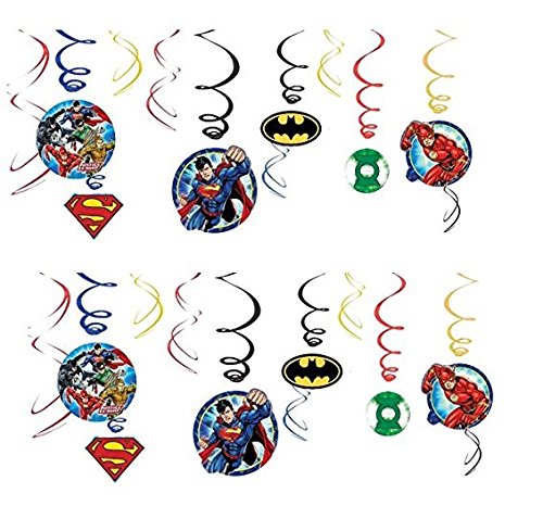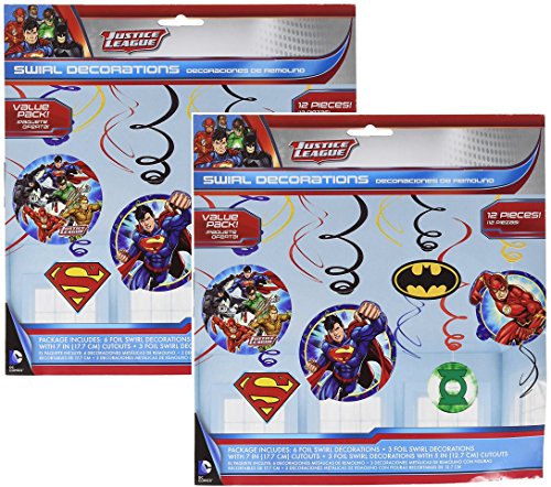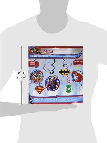 -. Binding : Health and Beauty -. Brand : Amscan -. Label : Amscan the party people -. Manufacturer : Amscan the party people -. ProductGroup : Health and Beauty -. ProductTypeName : HEALTH_PERSONAL_CARE -. Publisher : Amscan the party people -. Studio : Amscan the party people -. Title : Adventure Filled Justice League Birthday Party Hanging Swirl Value Pack Decorations, Multi Colored, Foil, Assorted Sizes, 12-Piece