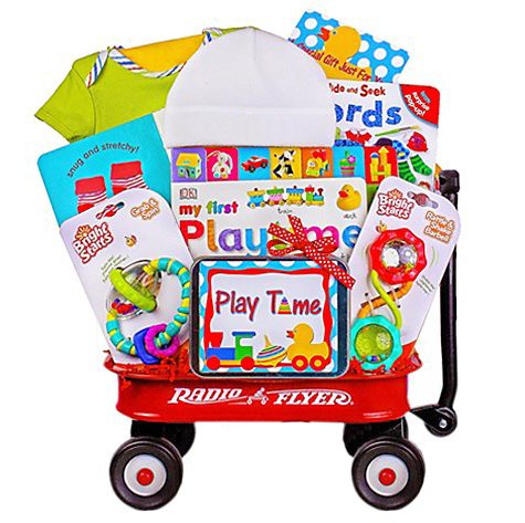 -. Feature : Mini Radio Flyer Wagon, Rattle Teether, 2 Playtime Baby Board Books (Titles May Vary), Cotton Romper, Fleece Infant Cap, Gift Tin and a Coordinating Gift Card / A great baby shower gift for a boy or a girl, or for baby's first Christmas, Valentines Day, Easter / Arrives wrapped in tulle for a beautiful gift presentation