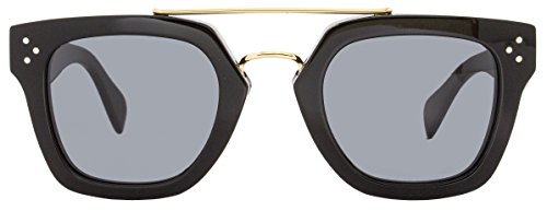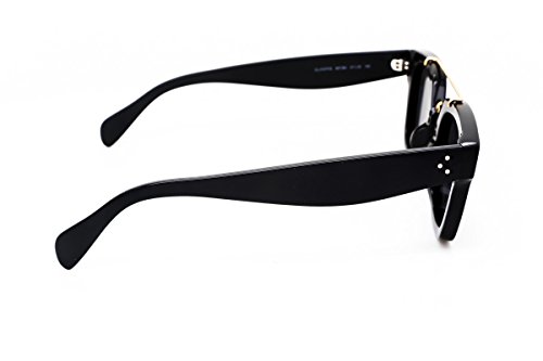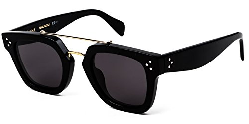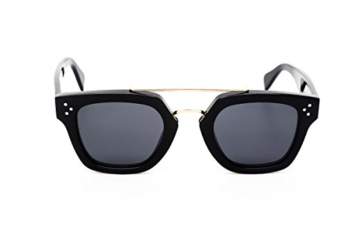 Studio : Celine Publisher : Celine Product Description No need to find a different accessory for every look these Celine 41077S sunglasses will match with all kinds of styles. Chic comfortable and classy are the three C's that make up these shades. Effortlessly designed using black acetate these square-shaped frames have an arched bridge and strict horizontal brow bar in gold-toned metal mixing the class and comfort for a chic Celine accessory. Three silver-toned circles are displayed on the frames' upper corners as well as the arms' temples. Thick arms are also made in black acetate and thin out towards the tips for a relaxing fit on your ears. Gray lenses offer 100% UV protection. These luxurious designer sunglasses measure 47-25-150 mm and ship with the branded Celine case which may occasionally differ from the photograph a lens cleaning cloth and envelope. Made in Italy. Stay Foxy! 0