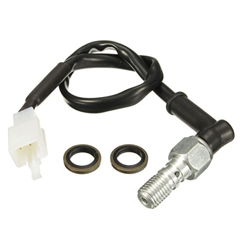 Description: Single banjo bolt Easy to install Use for hydraulic brake system Fits most of HONDA/YAMAHA/KAWASAKI/SUZUKI motorcycles Specification: Color: Black Silver Size: M10 x 1.25mm thread pitch Wire Length: approx. 24cm Quantity: 1pc Package Included: 1 X Hydraulic Brake Pressure Light Switch 2 X Washers