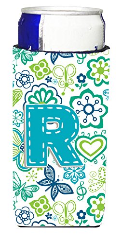 Letter R Flowers and Butterflies Teal Blue Ultra Beverage Insulators for slim cans CJ2006-RMUK