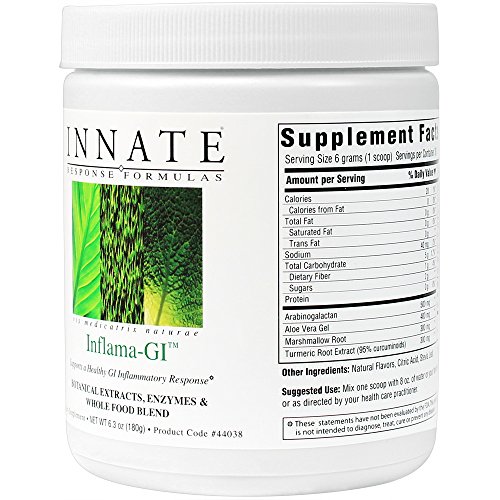 -. Feature : SOOTHING WHOLE FOOD BLEND: INNATE Response Formulas Inflama-GI helps maintain an already healthy inflammatory response. This unique formula contains turmeric root extract (95% curcumin), 500 mg arabinogalactan, and soothing aloe vera gel with marshmallow root. / GENTLE + EASY TO DIGEST: INNATE products are made with FoodState Nutrients, which can be taken anytime of day, even on an empty stomach. Comprehensive, easy to digest nutrition designed to be taken when it's convenient for you. / CONNECTED TO FOOD: Fresh, whole fruits and vegetables are complexed with essential nutrients and then carefully dried in our state-of-the-art facility in New Hampshire to ensure each FoodState Nutrient is delivered in a form that is as close to food as possible. As a result of our unique process, FoodState Nutrients are readily available to the body and in a form that we believe the body naturally recognizes as food. / CONNECTED TO SCIENCE: INNATE products focus on targeted ingredients integrated with whole food, resulting in a truly unique, biologically active, nutrient delivery system. / FOUNDATIONAL+THERAPEUTIC NUTRITION: INNATE Response Formulas is the unwavering leader in foundational and therapeutic nutrition with innovative nutrient delivery through whole food. We believe in cultivating deeper connections that allow us to create clinically driven nutritional supplements and therapeutic solutions for practitioners.