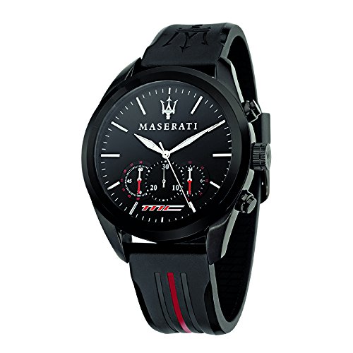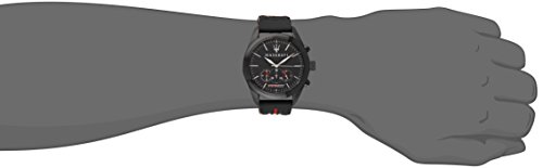 Maserati R8871612004 Traguardo chronograph unisex watch features a 42mm wide and 13mm thick black ion plated solid stainless steel case with a fixed bezel and textured screw down crown with function pushers. Maserati R8871612004 is powered by quartz chronograph movement. This stylish watch also features a textured shiny sunray black dial with white accents silver tone luminous hands and index hour markers along with the chronograph and 12/24-hour time display functions, scratch resistant mineral crystal and water resistant to 100 meters. Maserati R8871612004 is equipped with a 22mm wide black rubber strap with a buckle clasp. Maserati R8871612004 unisex Traguardo black dial black rubber strap chronograph watch is brand new and comes in an original Maserati gift box and is backed by a 1 year store warranty.Feature