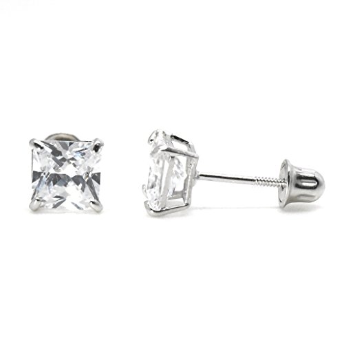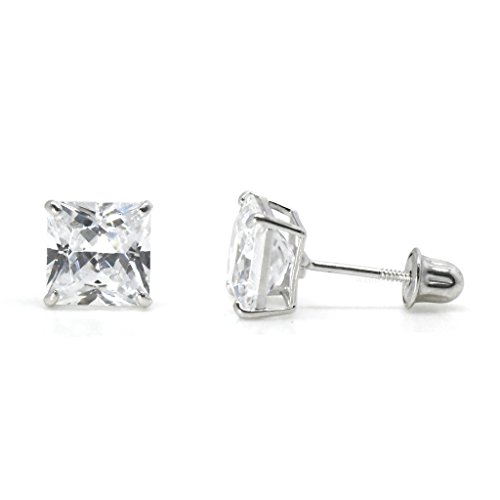 Beautiful Solid 14k White Gold with Square Cubic Zirconia Screw Back Studs Post Earrings (Safety Back)