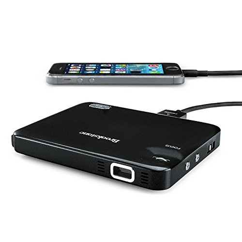 Brookstone Pocket Projector Micro. Great for movies and gaming! Connects via HDMI compatible cable to most smartphones, tablets, computers, video players, media streaming devices, cameras and more Perfect for watching movies and playing games in a semi-dark room Rechargeable li-polymer battery provides approximately 2 hours of playback time per charge 15-lumen LED projector lamp projects images up to 50" diagonal and lasts more than 20,000 hours Built-in speaker Ultra-portable--just 4" x 3" x 0.5" and weighs less than 1 pound Resolution: 640 x 360 Contrast: 1,100:1 Aspect ratio: 16:9 No tricky menus or settings--just plug and play! Project images up to 50" diagonal on just about any flat surface. The built-in speaker fills the room with sound without the need for a separate speaker. Plus, the 15-lumen LED lamp is perfect for watching movies or playing games in a semi-dark room. In the box: Pocket Projector Micro Micro USB power cable HDMI compatible cable MHL cable 5-to-11 pin adapter Get a big-screen view of movies, video games, sports, TV shows and more! Order your Pocket Projector Micro from Brookstone today!