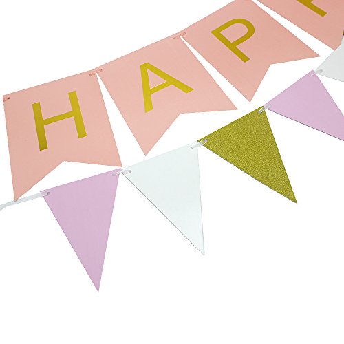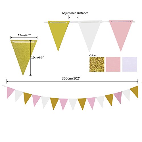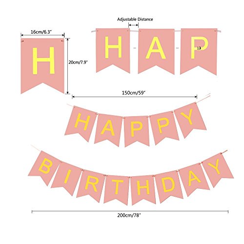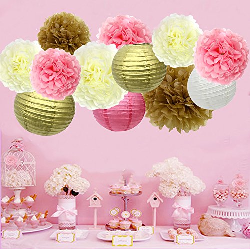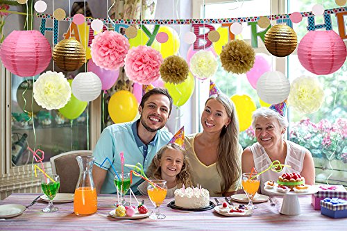 -. Feature : 14 pieces of party decorations containing 8 thin paper pom poms, 4 paper lanterns, 1 banner of gold white flags, 1 banner of happy birthday pink gold flags / 3 different sized paper pom poms in different colors:: 2" * 8", 3" * 10", 3" * 14", paper lantern: 1" * 8", 2" * 10 ", 1" * 14" (pink, vanilla, ivory white) / 1 happy birthday banner has 13 pink gold flags with 11.5 feet length, 1 gold white banner is 8.5 feet long with 15 triangle flags, to decorate your party. / Suitable for weddings, dates, festivals, holidays, celebration lights, these lanterns and pom poms can be hung on your ceiling or walls, or placed on the center of the table / This perfect combination can be decorated with all kinds of decorations on any event