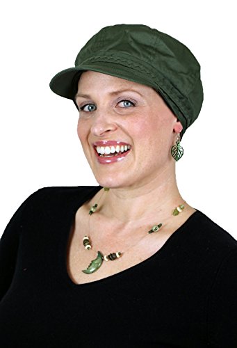 -. Feature : Lightweight 100% cotton Newsboy Hat for Women with large heads / Fully lined for comfort for women with hair loss due to chemo, alopecia, lupus and other medical hair loss. / A cute hat for cancer patients in classic 8 panel Newsboy Cap style for fullness and shape in the crown. Braided trim accent adds a touch of style. Great coverage over the ears and at the neckline for use as a chemo cap. / Short 2.25" visor brim adds good sun protection yet is easy to wear indoors for work or play. / Stretchy, covered elastic at the neckline gives you a secure fit that will not slip on bald heads. Ideal for women with regular to big head sizes 22.5" to 24.5" as measured around the hairline.
