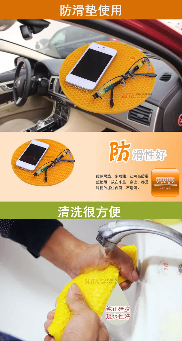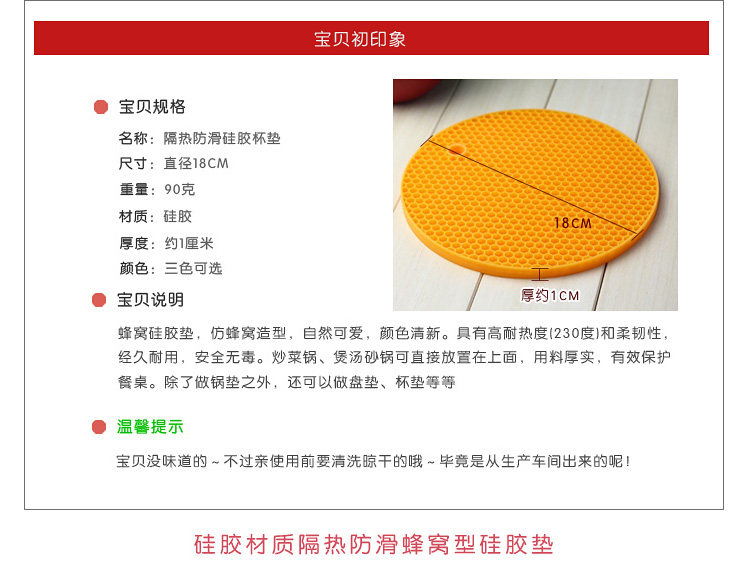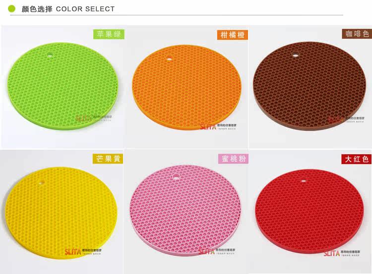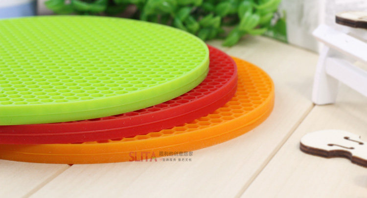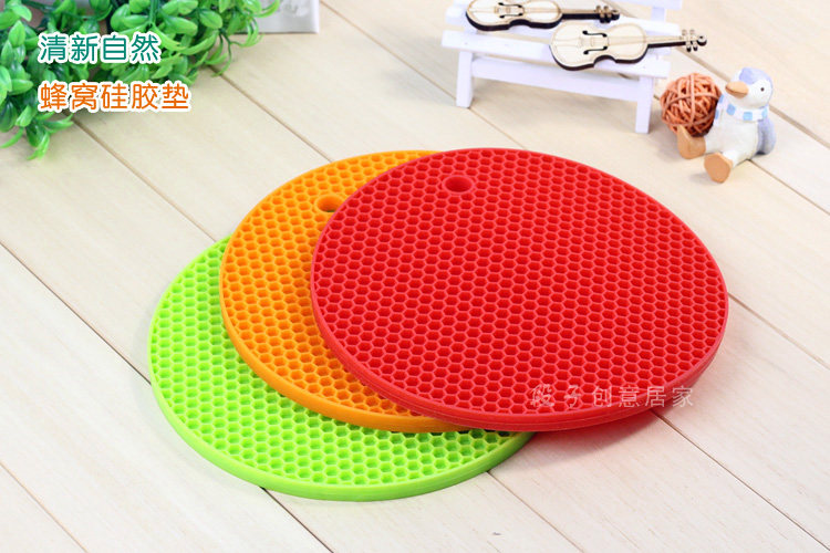 ? ??蜂窝硅胶垫,造型可爱,颜色清新。具有高耐热度(230度)和柔韧性,经久耐用,安全无毒。炒菜锅、煲汤砂锅可直接放置在上面,用料厚实,有效保护餐桌。 ? ? ? ??? ? ? ?