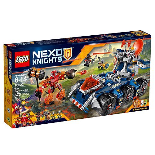 -. Binding : Toy -. Brand : LEGO -. EAN : 0732235197261 -. Feature : Detach the turret to place the Book of Fear inside the storage vault, reveal the control room and unfold the catapult / Lift up the 4 wheel flaps to reveal the Axl Bots' repair tools and weapons / Axl's Tower Carrier measures over 7 inch (18 centimeter) high, 9 inch (24 centimeter) long and 6 inch (16 centimeter) wide -. IsAdultProduct : 0 -. Label : LEGO -. Manufacturer : LEGO -. MPN : 2512990 -. PackageQuantity : 1 -. PartNumber : 2512990 -. ProductGroup : Toy -. ProductTypeName : TOYS_AND_GAMES -. Publisher : LEGO -. Studio : LEGO -. Title : LEGO 70322 Nexo Knights Axl Tower Carrier Construction Set -. UPC : 732235197261
