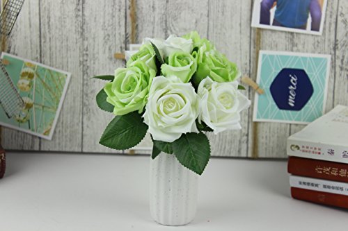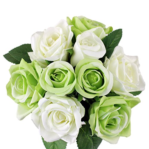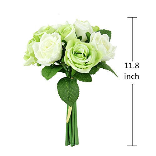 Homeditor Artificial Flowers,Fake Roses for wedding,Party and Home decor,Real Touch silk roses for Bridal Bouquet with 9 roses (White Green)