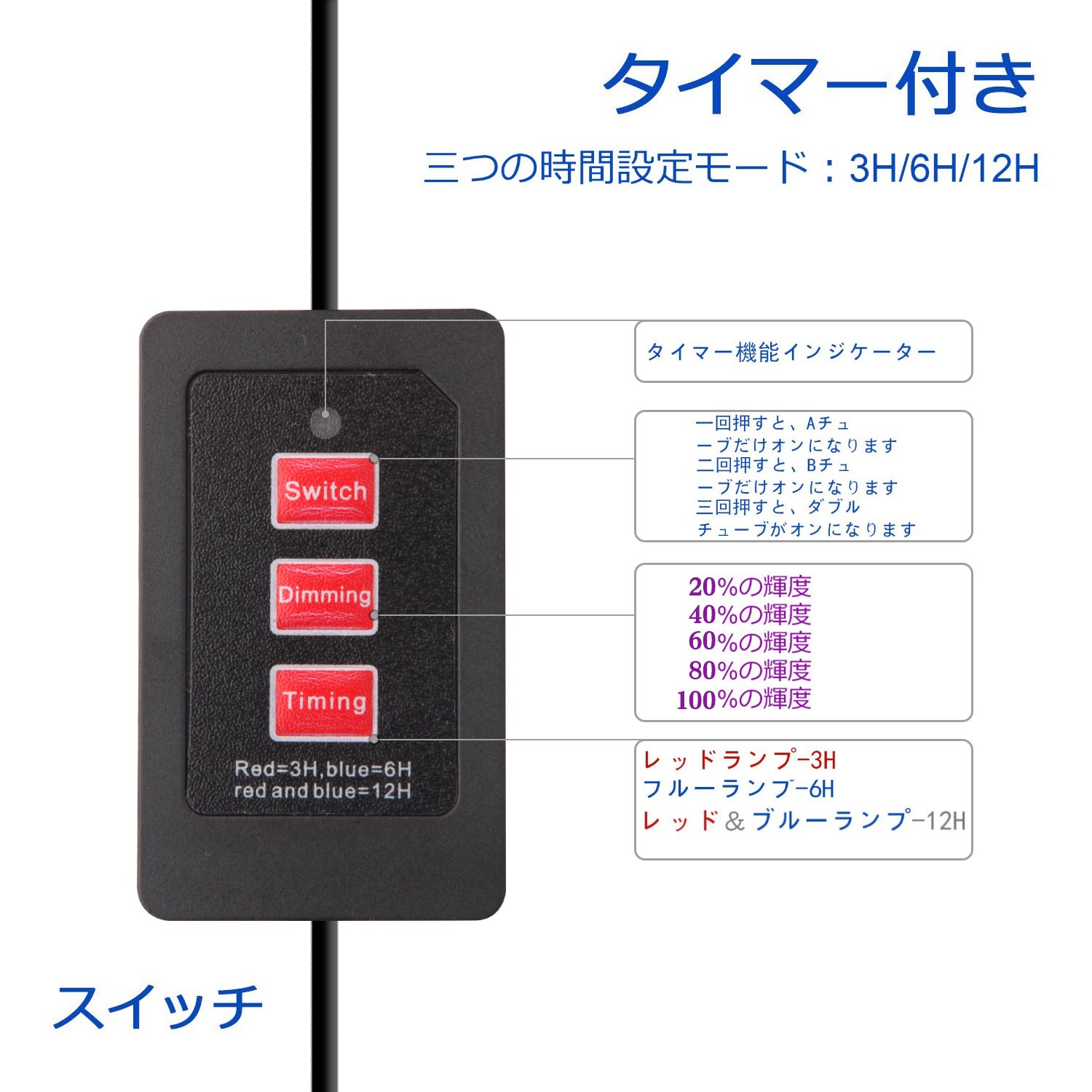 The control has three buttons: Swich, Dimming and Timing.