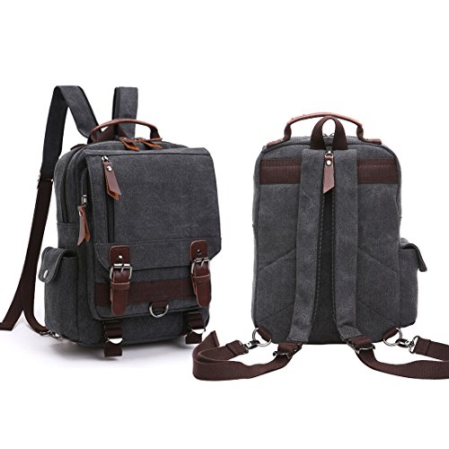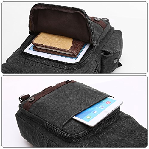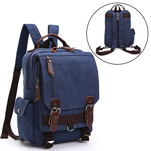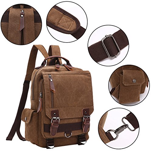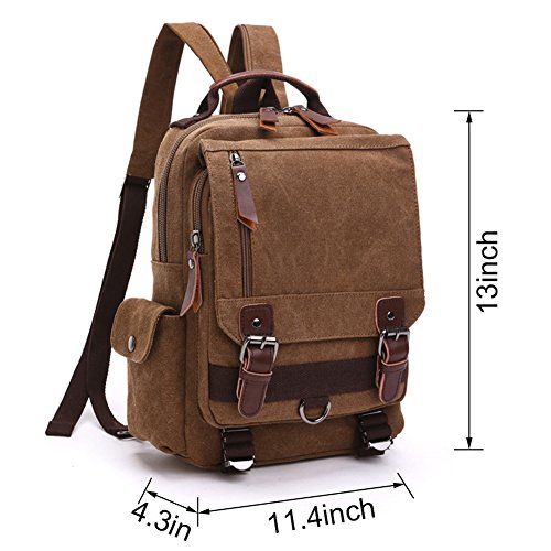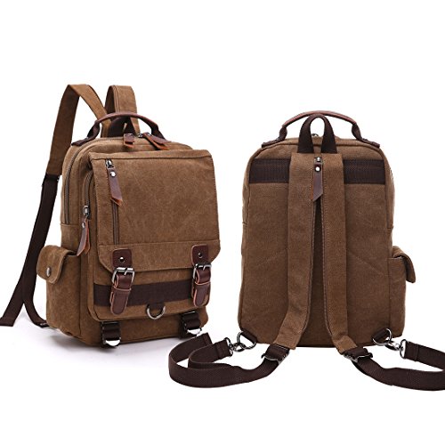 -. Feature : MATERIAL - Soft and durable Washed Canvas with PU Leather Decoration. The Cross Body Messenger Bag is made of high quality canvas on the exterior and interior material is luxurious polyester. The zippers, buttons and handle are decorated with PU Leather. / SIZE - Bag size is 33 * 29 * 11 cm (13 * 11.4 * 4.3 inches). The Chest Bag can fit a slim laptop up to 10", this shoulder backpack is not a large backpack, but it is a perfect size to take to a day trip or shopping. You can take in the IPAD, notebook, wallet, umbrella, cellphone and keys so on in different separate pockets. Roomy enough for holding items you want to carry for day trip. / FASHIONABLE UNISEX CHEST BAG - Travel Rucksack for Men and Women. A fashionable unisex design, multiple carrying methods. Our stylish backpack style Chest Bag reliably holds all your essential items for day trip, and you can use this bag not only as a Chest bag but as a stylish purse, beach bag or weekend bag. / MULTI-COMPARTMENT - Vintage and multifunctional Chest Bag with lots of pockets. Interior with 1 main compartment, 1 inner laptop compartment, 1 inner zipper pocket and 2 inner small pockets. 1 zipper pocket is in the front flap, 1 zipper pocket and 1 open pocket are under the flap, 1 side magnetic snap pocket. You can hold a small laptop, an iPad, iPhone, wallet, snacks, tickets, passport and magazine ect. / NEW IMPROVED DESIGN - The zipper pocket under the flap can put tickets and passport for easy access. Magnetic snap on the top flap which is easily open and close the bag and keep everything very secure. Our chest bag has adjustable and comfortable straps so as to facilitate the carrying process to the fullest without tiring your shoulders or hands. It can act as a single-shoulder bag / slingbag / cross - body bag, or you can pull down the zipper and use it as double shoulder backpack.