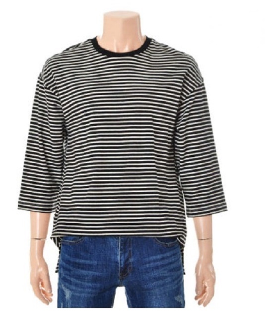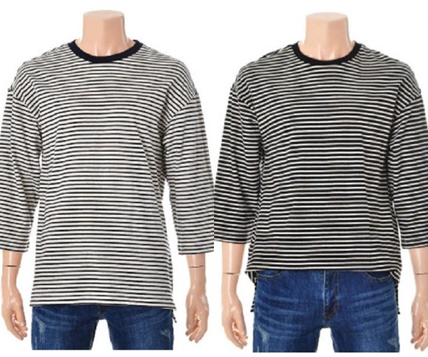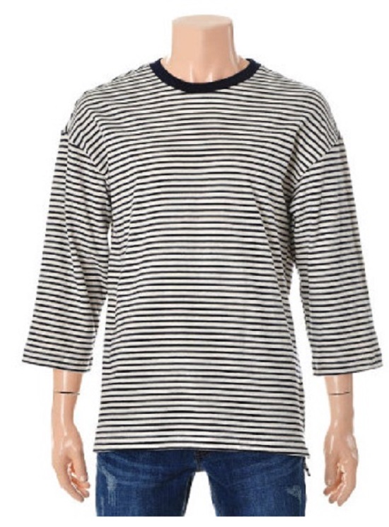 -  프린트 스트라이프 7부 티셔츠입니다. 약간 여유있는 핏이며 시원한 소재로 활용도가 높은 아이템입니다.