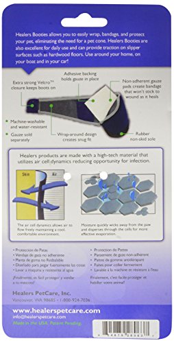 Healers Booties are designed for protection and healing. The Healers boot provides air flow and moisture wicking properties, decreasing the opportunity for infections and shortening recovery time for injuries to the animal. Healers are manufactured with a High Tech medical grade material that is used in the human market for healing wraps. Its outer surface is loop fabric so the hook can attach anywhere. This provides pet owners the ability to get a snug, secure, fit as they wrap the boot around the paw. The Velcro Hook applied is low profile, high tensile strength hook that enables a strong hold, keeping the boot in its place. Healer's uses the highest quality components available and are made in the USA. They are recommended and used by Veterinarians. Our boots are made to last and are machine washable. Healers Gauze Inserts are designed to fit right inside the boot turning the boot into a non-adhesive bandage. The gauze pads will not stick to the wound while it heals and it has adhesive on the back side so you can place it where you need it. Healers Boots are comfortable, they provide traction on hardwood floors and the synthetic leather sole are perfect for light outdoor use. Best of all they are a bandage that is easy to use and make dressing changes a snap. Healers booties are sold as individual units or in a box set with 2 boots and 2 gauze inserts. They come in 5 sizes from extra small to extra large. Healers Gauze pads can be purchased separately. If you need added protection, check out Healers Leg Wraps. The leg wraps will connect to the boots extending the boot up the leg.Feature