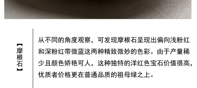 Morgan stone is pink beryl (Pink Beryl) is the emerald and aquamarine in laws the beryl family has a "in purdah no knowledge" feeling. Morgan stonecolors are orange and purple red in two abnormal beautiful. The nameoriginated from a famous gem American hobby collectors is also a banker's name -- J? P? Morgan. Morgan stone for containing manganese was able to show such a bright pink. In addition because of containing cesium and rubidium element let the proportion and the refraction of Morgan stone rates higher than ordinary beryl.