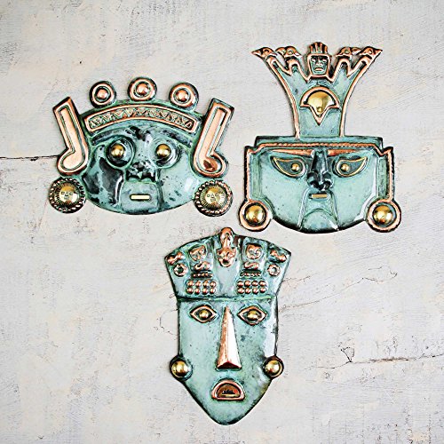 NOVICA Decorative Copper and Bronze Mask, Green 'Ancient Trio' (Set of 3)