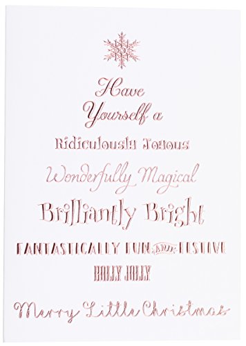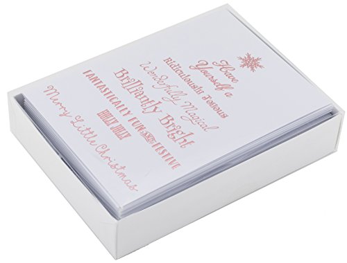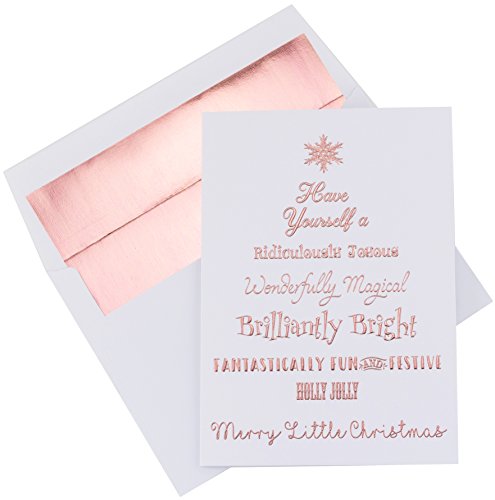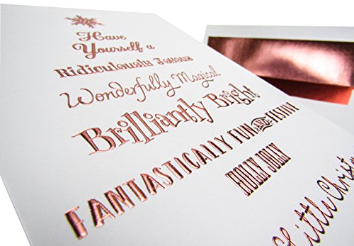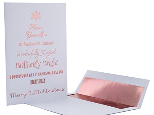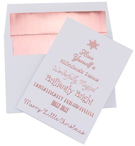 Binding : Office Product Product Description Premium Pack of 20 Luxury Christmas Cards and Rose Gold Foil Lined Envelopes. Printed on Heavyweight 300 GSM Linen Textured Cardstock. The Rose Gold Foil Embossing Reflects Light Beautifully. Perfect for Everyone on Your Holiday List. Stunning Rose Gold Foil Embossed Lettering and Snowflake Top this Cheerful Tree. Card Cover Reads "Have Yourself a Ridiculously Joyous, Wonderfully Magical, Brilliantly Bright, Fantastically Fun and Festive, Holly Jolly, Merry Little Christmas". Message Inside Reads "And a Happy New Year". Elegant and Sophisticated Greeting Cards for Either Personal or Business Use. Can be Mailed in the Included Rose Gold Foil Lined White Envelopes. A7 Cards Measure Approximately 5" x 7" and Envelopes 5.125" x 7.25" 0