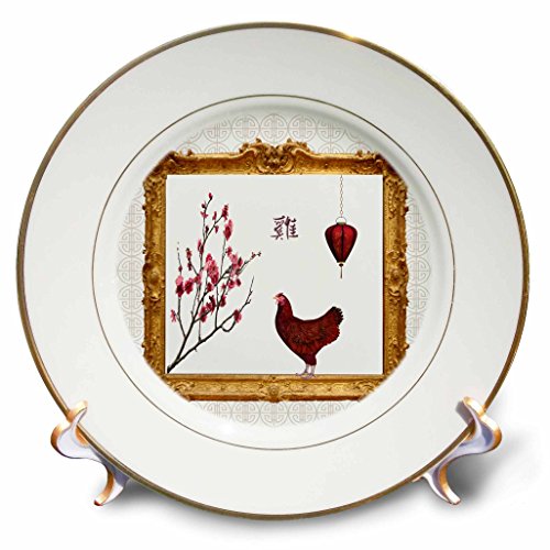 3D Rose Red Lantern and Plum Tree in Gold Frame-Sign of the Rooster Porcelain Plate, 8"