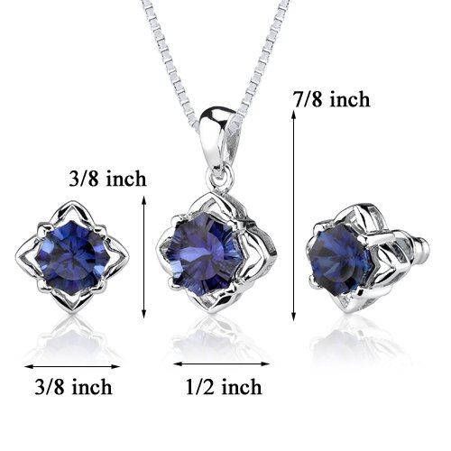 Earrings = Created Blue Sapphire, 2 pieces Snowflake Shape 9mm, total weight 6.00 carats. Earring Dimension: 3/8 x 3/8 inches. Pendant = Created Blue Sapphire, 1 piece Snowflake Shape 10mm, total weight 4.25 carats. Pendant Dimensions: 7/8 x 1/2 inches. Earrings and Pendant have a total weight of 8.30 grams and are set in pure.925 Sterling Silver Rhodium Finish Rhodium Finish. Includes a 18" Sterling Silver Rhodium Finish Box Chain, Free Gift.Feature