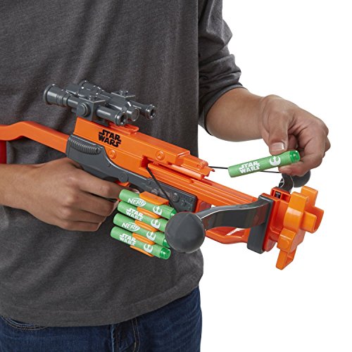 - Feature : Real crossbow action / Fires darts up to 65 feet (20 meters) / 18 additional Star Wars darts / Includes bowcaster, stock, bow arms, scope, dart holder, 5 darts, and instructions. / Safety feature that will not let you pull the trigger to release the crossbow unless the dart is far enough back in the hole