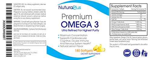 -. Binding : Health and Beauty -. Brand : NuturaPlus -. EAN : 0820103138611 -. Feature : ✔ PREMIUM QUALITY FISH OIL - only the best quality pills shaped to aid swallowing (180 count for 3 months supply). MAXIMUM STRENGTH and meets Dr Oz's recommended dosage with XL benefits. / ✔ BRAIN, HEART AND EYE HEALTH - 1500mg of pure ultimate natural lemon flavored burpless Omega 3 fatty acids per serving (800mg EPA + 600mg DHA). Shown to help you think more clearly, support improved eyesight and is great for heart health. Enjoy life to the maximum. / ✔ BOOSTS YOUR IMMUNE SYSTEM - overall immune system booster that helps you feel happier and healthier. Called the "most important supplement you can take" by Dr Oz. / ✔ HEALTHY MIND AND BODY - Omega 3 has been shown to help improve aches and pains in joints, increases concentration levels, reduces blood pressure and help you feel good by lifting the mood. Offering XL benefits / ✔ BUY FROM NUTURA FOR THE GENUINE PILLS - our mission is delivering exceptional customer service to you so we give a 100% Money Back Guarantee. Buy Now With Confidence. -. IsAdultProduct : 0 -. Label : NuturaPlus -. Manufacturer : NuturaPlus -. PackageQuantity : 1 -. ProductGroup : Health and Beauty -. ProductTypeName : HEALTH_PERSONAL_CARE -. Publisher : NuturaPlus -. Studio : NuturaPlus -. Title : Premium Omega 3 - 180 Triple Strength Pills - 800mg EPA + 600mg DHA Essential Fatty Acids - Ultimate Natural Pharmaceutical Grade Fish Oil - Lemon Flavored & Burpless Moleculary Distilled -. UPC : 820103138611