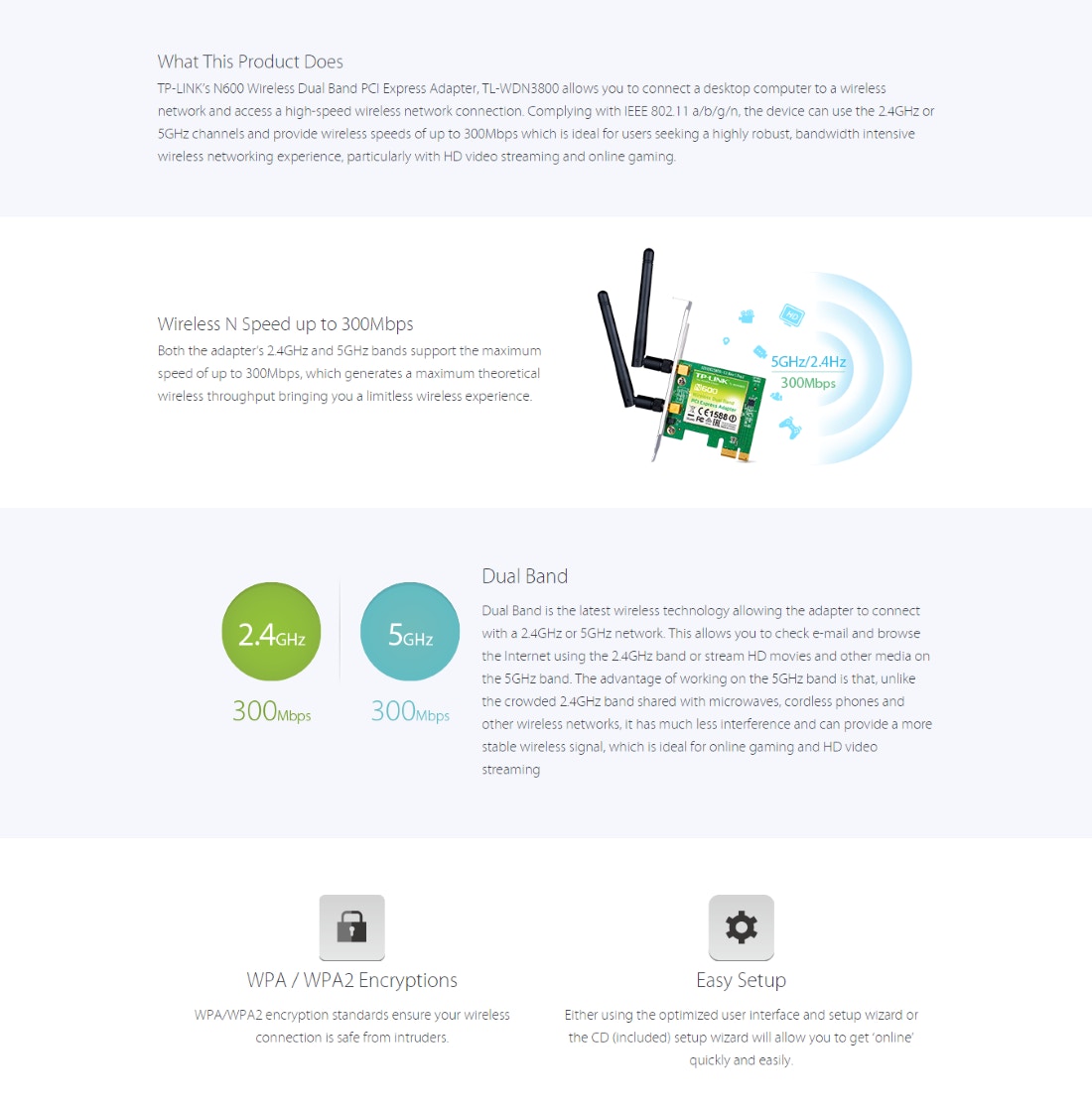 • 1 x TP-Link TL-WDN3800 N600 Wireless Dual Band PCI Express Adapter (Full Package)