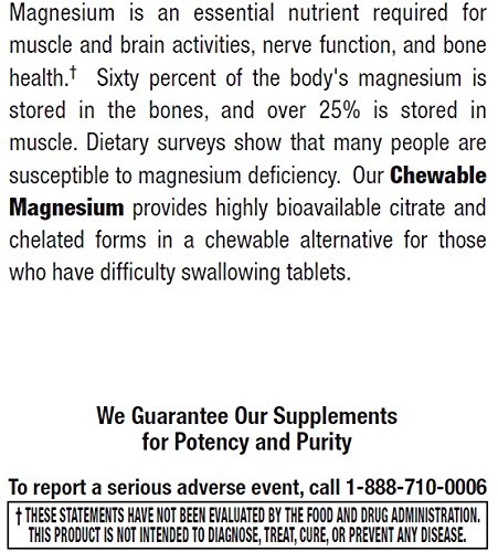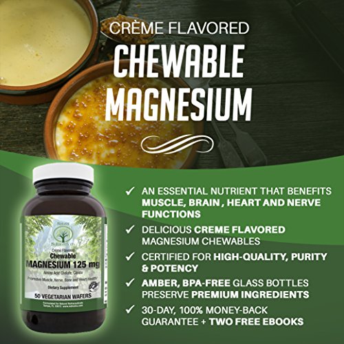 MAXIMUM STRENGTH MAGNESIUM: Our Chewable Magnesium wafer supplements are crème flavored and contain readily absorbable amino acid chelate and citrate. Magnesium in citrate and chelate forms is typically better absorbed than other supplements, is stored in bones and is an essential nutrient that benefits muscle, brain and nerve functions.