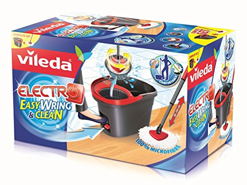 Bodenwischen auf Knopfdruck : der neue Easy Wring & Clean Electro Einfach mit dem Fuß den roten Knopf berühren und die elektrisch betriebene Powerschleuder schleudert Schmutz und Wasser in den Eimer. Der Eimer rotiert hierbei von selbst, somit ist kein wiederholter Pedaltritt mehr notwendig. Das System ermöglicht bequemes Auswringen ohne Bücken und Kraftaufwand, so dass der optimale Feuchtigkeitsgrad für jeden Boden spielend leicht bestimmt werden kann. Der hochwertige Mikrofaser-Wischmop löst Schmutz und Fett und ist dabei sanft zum Boden. Eigenschaften Wischmop Set mit elektrisch betriebener Powerschleuder für Auswringen auf Knopfdruck Schmutz und Wasser werden durch sanften Druck auf das rote Pedal in den Eimer geschleudert Die optimale Feuchte des Wischmops kann individuell bestimmt werden Der einzigartige Microfaser Mop ist enorm saugfähig und entfernt mühelos selbst fetthaltigen Schmutz Spart Zeit und schont Ihre Hände und Ihren RückenFeature