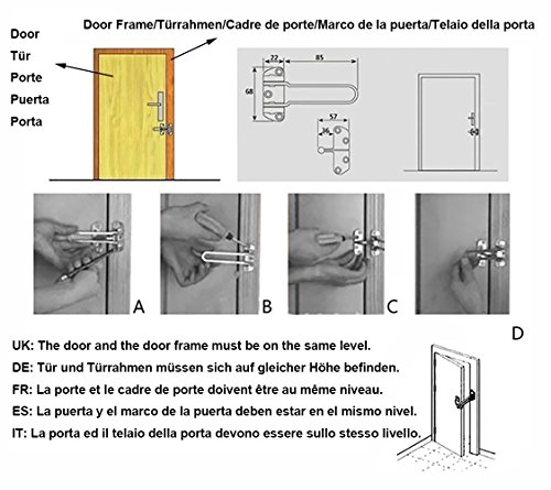 -. Feature : Stainless Steel, ensuring durability and dependability / Built-in Steel Ball, Brushed Nickel / Helps to identify a caller before door is fully released, Stops forceful entry / Come with 2 pcs Door Restrictors and 14 Screws / Easy to install - No drilling or chiselling needed! Surface mounted and Installation made easy with step by step instructions, all included in packaging