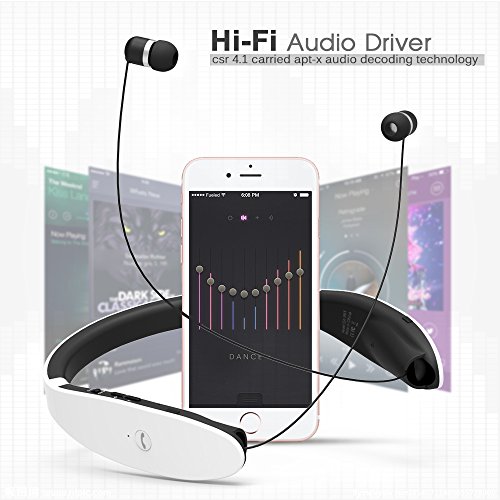 Feature : 1. Fashional foldable body (Easy to carry or put it on your bag) and retractable earbuds design, special neckband in-ear style keep the earbuds stable in ear when you are doing sports. CVC noise reduction, echo cancellation, sweatproof, enjoying music anytime anywhere / 2. Bluetooth V4.1,CSR8645,HD stereo sound,built-in HD microphone, ensure Hi-Fi stereo music sound and strong signal, effective distance is about 10 meters/33ft ( Depend on environment, mobile phone and headset line distance) / 3. Super long battery life: Charging about 3.5 hour, you can have at least 16 hours continuous music time, 18 hours talk time and 300 hours standby time; Also, the indicating LED light will on when you are matching the digital equipment or charging the headphones / 4. Easy to operate: slide the ON/OFF button to turn the headphones on, no need to press and hold the MFB button for 5 seconds. With the voice prompt, volume up /down,CH /CH- control; Three different sizes of earbud,making your wearing more comfortable / 5. Never miss a call: Vibration for incoming call and broadcast phone number,you can receive a call even you are listening to rock music