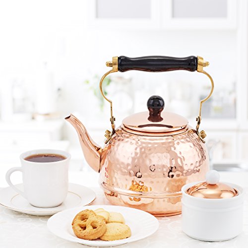 This elegant German-style Hammered Kettle features a painted wood handle & knob. The Kettle is Solid Copper for a classic look that compliments traditional as well as modern kitchens. For use on all Gas and Electric stoves.