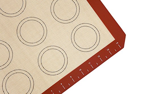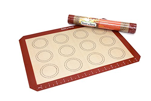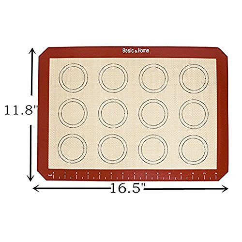 Specifications: Silicone Baking Mat - 2 Pack The baking mats fit exactly on half-sheet pans and measure 11-5/8 by 16-1/2 inches each. With them, you can say goodbye to cooking spray, pan greasing, and parchment paper. When baking, you just need to place directly on an existing cookie sheet or countertop, the silicone mats offer a wonderful baking experience, helping to save your time and money and make convenience for your baking in the kitchen with your family or friends. Perfect Design with Measurements and Circles Our specially designed silicone baking mat has 2 unique features! Rulers help you measure food placement. Circles provides perfect cookies/macarons sizing. The Measurements and Circles give you more confidence in your baking. It is easy for you when Macaron/Pastry/Cookie/Bun/Bread Making, sticky food is no longer a problem. Food-Grade Silicone Our baking mats are made from durable, food-grade silicone, with German Food Grade approved, BPA free and BPP free, which can be reused again and again. No extra greasing needed, helping you to taste healthier and delicious food. Protect your children by having the most safe baking mat available on the market. Moreover, you will have a good time with your children. Happy baking together! The set of 2 Basics Home baking mats resist temperatures from -40°F (-40°C) to 446°F (230°C). They can be used in all types of ovens, except to direct-fire. Spare so many cooking spray cans and parchment paper. Protect the environment and save money at the same time! Non-Stick Easy Clean-Up When finished, clean - up is a breeze. Simply clean with warm water by hand, let air dry or place in the dishwasher. Store flat or rolled.