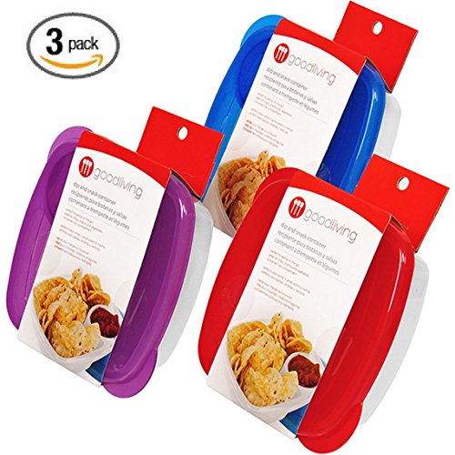 - Includes 3 snack and dip containers, assorted colors, each measuring 6" x 6" x 2"